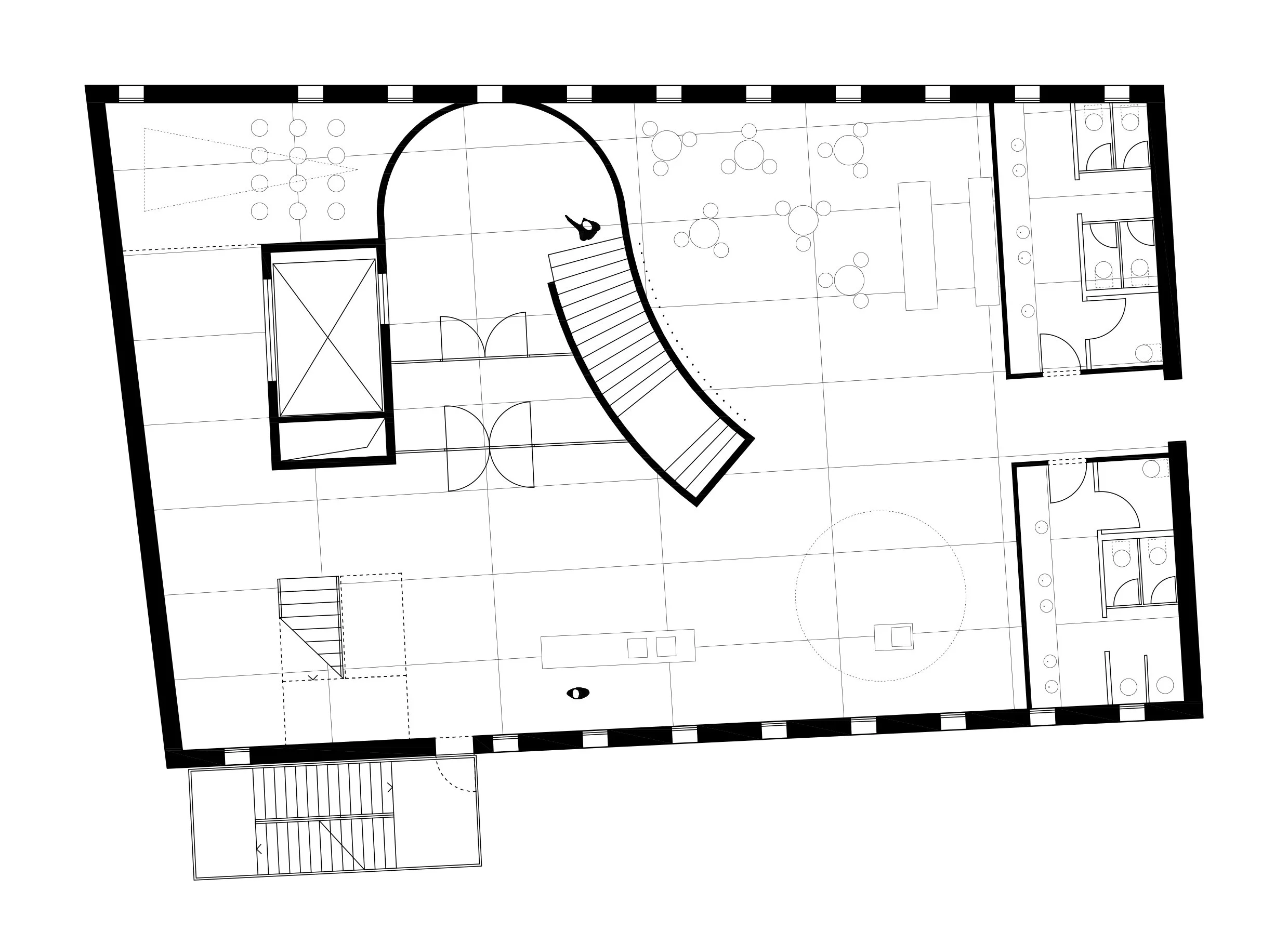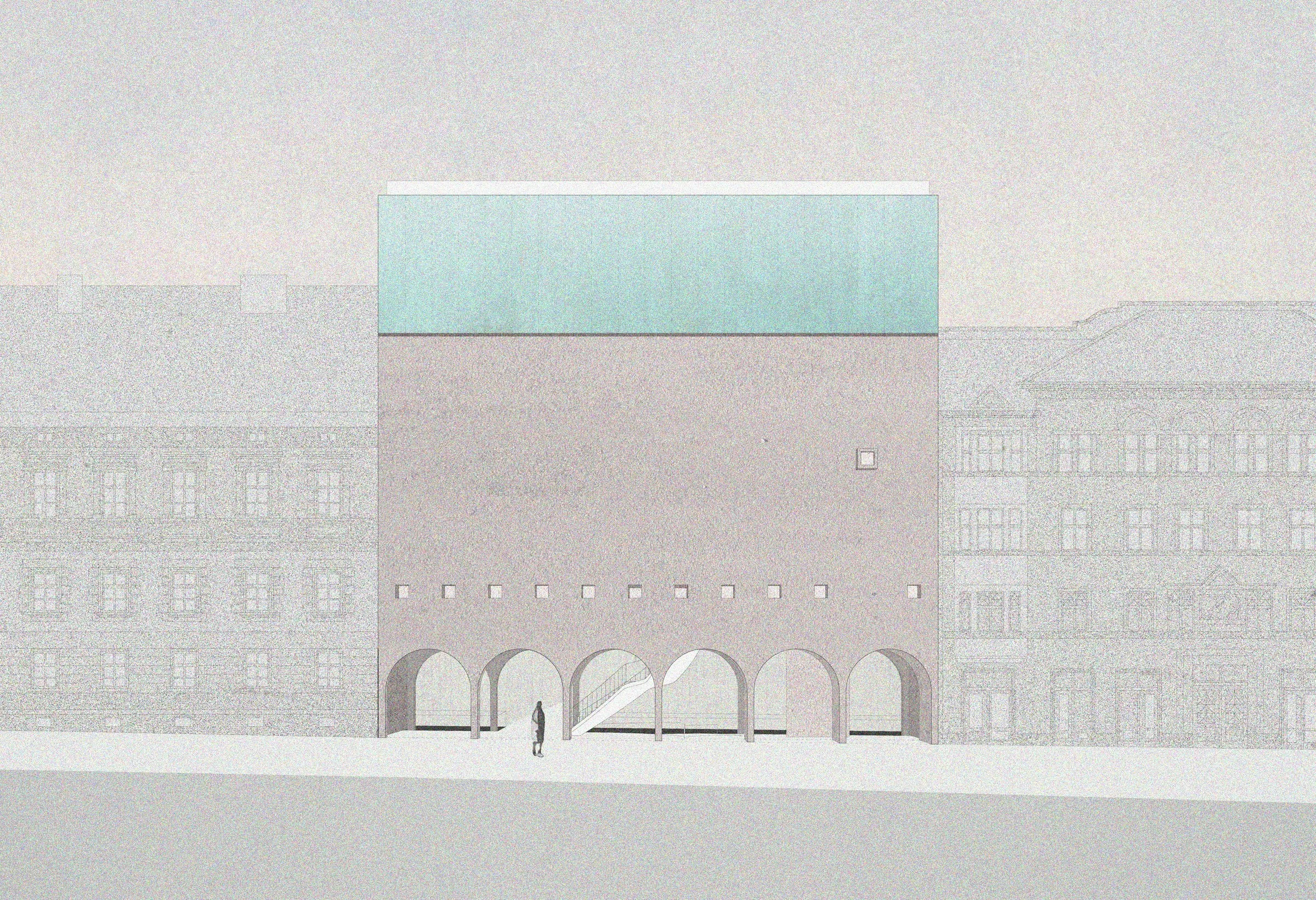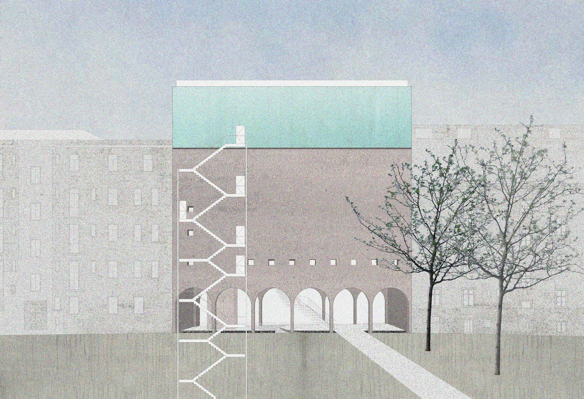 Oslobođeno prizemlje kuće stvara gradsku vežu: prazninu omeđenu Ilicom, parkom i zabatima susjednih kuća. Zauzimanje prostora u potpunosti je omogućeno, zapravo, poželjno: veža je ulaz, izložbeni prostor ili pak obična tramvajska stanica. Svačija i potpuna praznina programski razdvaja kuću Aluartforuma.